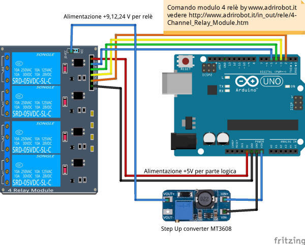* Il modulo DC/DC Step Up converter basato sull'integrato MT3608 è opzionale nel caso si utilizzi un modulo con relè con tensione diversa dai 5V.
